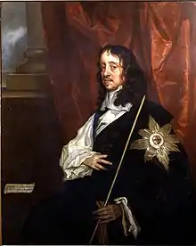 Thomas Wriothesley, 4th Earl of Southampton, KG (/ˈraɪəθsli/ RY-əth-slee;[1] 10 March 1607 – 16 May 1667), styled Lord Wriothesley before 1624, was an English statesman, a staunch supporter of King Charles II who after the Restoration of the Monarchy in 1660 rose to the position of Lord High Treasurer, which term began with the assumption of power by the Clarendon Ministry. He "was remarkable for his freedom from any taint of corruption and for his efforts in the interests of economy and financial order,"[2] a noble if not completely objective view of his work as the keeper of the nation's finances.[3] He died before the impeachment of Lord Clarendon, after which the Cabal Ministry took over government.