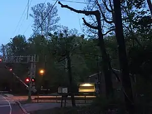 Trolleys arriving at this station travel between 69th Street Terminal in Upper Darby, Pennsylvania and Orange Street in Media, Pennsylvania. The station has a shed with a roof where people can go inside when it is raining. This shed is a traditional "Red Arrow" shed located in an area that's both wooded and residential. Because of this, no parking is available at this station. Thomson Avenue climbs a hill on the west side of this stop as it prepares to terminate at Springfield Hospital on Sproul Road (PA 320), which has a stop of its own at Springfield Mall.