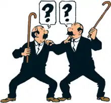Thomson and Thompson (French: Dupont et Dupond [dy.pɔ̃])[1] are fictional characters in The Adventures of Tintin, the comics series by Belgian cartoonist Hergé. They are two incompetent detectives who provide much of the comic relief throughout the series. Although they look like identical twins whose only discernible difference is the shape of their moustaches, they are in fact just doubles not brothers,[2] just as the different spellings of their surnames suggests. They are afflicted with chronic spoonerisms, are extremely clumsy, thoroughly clueless, and usually intent on arresting the wrong character. In spite of this, they somehow are entrusted with delicate missions.