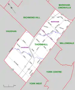 It covers the community of Thornhill, Ontario, which is made up of portions of Vaughan and Markham, and was created in 1999 from parts of Markham and York Centre ridings.