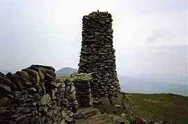 The grassy top is crossed by a stone wall which rises up from Threshwaite Mouth and then peters out a few hundred yards to the east of the summit. A section of old fenceposts then continues the boundary line toward High Street before again being replaced by stone wall. The actual top is marked by one of the most impressive columnar cairns in the district. Named Thornthwaite Beacon, it towers 14 feet above an angle in the wall.[1]