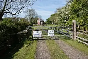 ![]() Looking along the dismantled line towards the former station house and the site of the station (2019) | |