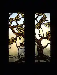The entry hall is paneled in Burmese Teak while the living and dining rooms are paneled in Honduras Mahogany with ebony pegs covering the screws. The fireplace in the living room is encased in mauve tile from the Grueby Faience Company. The front door contains leaded art glass in the pattern of a gnarled grape vine, executed by Emil Lange, who also worked on the Gamble House. The Greenes were originally commissioned to make furniture for the dining room, but were later called back to make additional pieces.
