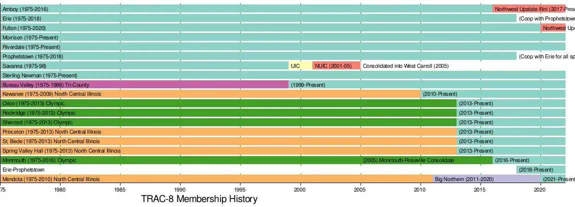 Prior to the development of the TRAC-8, the IHSA was pushing teams to end multi-state conferences. Therefore, Fulton, Morrison, Riverdale, Savanna and Newman came from the dissolved Illowa Conference, Amboy left the Wisconsin-Illinois SHARK Conference and Erie and Prophetstown, then competing as individual high schools, left the Iowa-Illinois Pleasant Valley Conference.