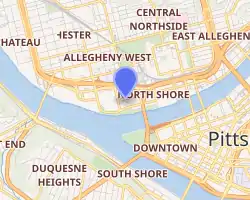 In 1958, the Pirates sold Forbes to the University of Pittsburgh for $2 million ($18.8 million today). The university wanted the land for expanded graduate facilities.[11] As part of the deal, the university leased Forbes back to the Pirates until a replacement could be built.[12] An early design of the stadium included plans to situate the stadium atop a bridge across the Monongahela River. It was to call for a 70,000-seat stadium with hotels, marina, and a 100-lane bowling alley.[13] Plans of the "Stadium over the Monongahela" were eventually not pursued.[14] A design was presented in 1958 which featured an open center field design—through which fans could view Pittsburgh's "Golden Triangle".[15] A site on the city's Northside was approved on August 10, 1958, due to land availability and parking space,[15] the latter of which had been a problem at Forbes Field.[9] The same site had hosted Exposition Park, which the Pirates had left in 1909.[16] The stadium was located in a portion of downtown difficult to access;[11] political debate continued over the North Side Sports Stadium and the project was often behind schedule and over-budget.[15][17] Arguments were made by commissioner (and former Allegheny County Medical Examiner) Dr. William McCelland that the Pirates and Steelers should fund a higher percentage of the $33 million project ($275.6 million today). Due to lack of support, however, the arguments faded.[15][18]