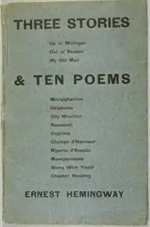 Three Stories and Ten Poems is a collection of short stories and poems by Ernest Hemingway. It was privately published in 1923 in a run of 300 copies by Robert McAlmon's "Contact Publishing" in Paris.[1]