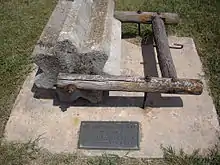 The threshing stone is a cylindrical stone with teeth carved into it. Stones made in Kansas were approximately 29 to 30 inches long, 23 to 24 inches in diameter, with 7 notches (and rarely 8) resembling gear teeth, made of limestone, and 600 to 800 pounds in weight.[2][1] Some smaller stones may weigh less than 400 pounds.[3]