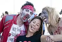 Landis said directing Jackson was "like dealing with a gifted 10-year-old". He described Jackson as "emotionally damaged ... He was tortured, but he was happy-go-lucky for a lot of it. He worked very hard. He really was childlike."[9] Jackson wanted to make a video in which he transformed into a four-legged beast, similarly to the transformation scene in An American Werewolf in London. This idea was replaced with a two-legged monster, as this made it easier for him to dance.[8] Landis felt Jackson should become scary and creepy, but not ugly. Landis suggested that Jackson should become a werewolf in a 1950s setting, inspired by the 1957 film I Was a Teenage Werewolf.[8] Makeup artist Rick Baker decided to turn Jackson into a werecat "because I just didn't want to do another werewolf".[12] According to Landis, the production involved the largest makeup team in film history up to that point, with 40 makeup artists.[9]