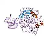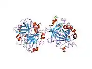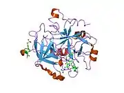 Thrombin (EC 3.4.21.5, fibrinogenase, thrombase, thrombofort, topical, thrombin-C, tropostasin, activated blood-coagulation factor II, blood-coagulation factor IIa, factor IIa, E thrombin, beta-thrombin, gamma-thrombin) is a serine protease, an enzyme that, in humans, is encoded by the F2 gene.[5][6] Prothrombin (coagulation factor II) is proteolytically cleaved to form thrombin in the clotting process. Thrombin in turn acts as a serine protease that converts soluble fibrinogen into insoluble strands of fibrin, as well as catalyzing many other coagulation-related reactions.