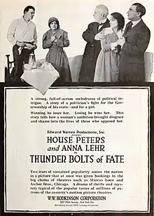 Thunderbolts of Fate is a 1919 American silent drama film directed by Edward Warren and starring House Peters, Anna Lehr and Ned Burton.[1]