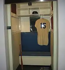 The locker that Munson used, along with a bronzed set of his catching equipment, was donated to the Baseball Hall of Fame. Despite a packed clubhouse, Munson's final locker position was never reassigned. The locker next to Yankee team captain Derek Jeter's, with Munson's number 15 on it, remained unused as a tribute to the Yankees' lost catcher in the original Yankee Stadium until the Stadium closed in 2008.[28] Munson's locker was moved in one piece to the New Yankee Stadium. It is located in the New York Yankees Museum. Visitors can view the Yankees Museum on game days from when the gates open to the end of the eighth inning and during Yankee Stadium tours. Munson's number 15 is also displayed on the center-field wall at Thurman Munson Stadium, a minor-league ballpark in Canton. Munson is buried at Canton's Sunset Hills Burial Park.