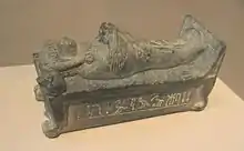 He is known from a relatively small number of objects. A small schist statuette in the Louvre Museum shows the prince as a miller and another small schist statue in Berlin depicts him as a mummy lying on a bier.[3] The miller statuette is inscribed on three sides with this text: