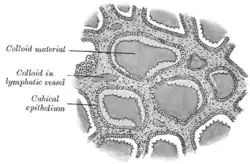 ![]() Section of thyroid gland of sheep. X 160. ("Cubical epithelium" labeled at center left.) | |
