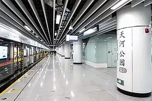 Tianhe Park station (Chinese: 天河公园站), is a station of Line 21 of the Guangzhou Metro. It started operations on 20 December 2019.[1] With the opening of Line 11 in 2023, line 21 will be truncated to here from Yuancun, as to allow line 11 trains to serve that station instead. It will also be an interchange station with Line 13 in 2023.[2]