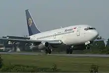 - On October 3, 2006, a Boeing 737-200 arriving from Balikpapan skidded 50 meters off the runway during landing at Tarakan. There were no injuries. Visibility was below 400 meters at the time due to heavy haze.[42] Months later, on December 18, another Boeing 737-200 skidded off the runway at Malang due to adverse weather. No injuries were reported to the 77 passengers on board.[43] Malang was the scene for another incident on November 1, 2007, when another Boeing 737-200 skidded when landing due to adverse weather. No serious injury occurred, but 5 persons were slightly injured out of 89 passengers and crew members.[44]