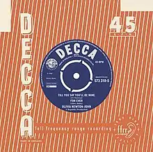 Perhaps the most known version of "Till You Say You'll Be Mine", though never a hit, was the first ever single recorded by Australian singer Olivia Newton-John. As the prize for winning a talent competition on Australian TV series Sing, Sing, Sing in 1965, Newton-John went to the United Kingdom and recorded the song as her debut single, being released by Decca Records on 13 May 1966. The song "For Ever", written by Freddie Allen and Julian Bailey, was included as the B-side. The single does not credit the songs's producer(s), simply reading that it is "A Republic Production".[1][2][3]