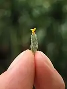 Tillandsia bryoides is an extremely small species with thin stems (3–5 mm in diameter), covered in densely packed, imbricate, strict (held against the stem), succulent leaves. It has a single, non-stemmed, self-fertilising flower, with yellow petals. It grows in strong or dappled light, with regular moisture.[1][2][3]