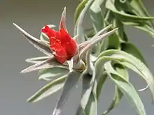 Tillandsia edithae produces "pups" at the base and along the stem. These flowers have beautiful crimson red blooms and quick growing roots. They have alternating stiff or leathery strap-shaped leaves. Leaf colour varies from silver to shades of green blushed with other bright colours. Leaf texture is soft or ridged and leaves are covered in scales or hairs (trichomes) that collect water and nutrients for the plant.