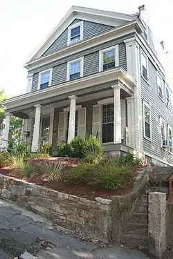 The Raymond House is set on the north side of George Street, a side street that steeply climbs the hill to the west of Worcester's Main Street and downtown. It is a 2+1⁄2-story wood-frame structure, with a front-facing gable roof, and clapboard siding. The building corners are pilastered, and a single-story porch extends across the front, with fluted Doric columns rising to an entablature and hip roof. The wall under the porch is flushboarded, with long sash windows and the entrance set in the leftmost of three bays. The gable above is fully pedimented, with a sash window at the center.[2]