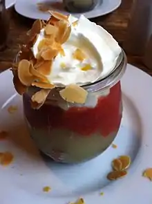 Example of a recipe: mashed apples (or other mashed fruits) are spread out at the bottom, followed by a layer of whipped cream, a layer of toasted bread- or rusk crumbs, followed by another layer of whipped cream and usually a thin layer of crumbs on top. Possible decorations also include hazelnuts or flaked almonds.[3]