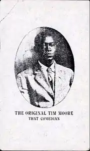 Moore left Doctor Mick, first to become a stableboy and later a jockey. He also tried his hand as a professional boxer under the name "Young Klondike" in 1905, and found it lucrative.[9][10] He returned to performing in 1908, with a troupe of minstrels called "The Rabbit's Foot Company."[11] By 1909, he was back in vaudeville and had met and married his first wife, Hester. They performed as a team, "The Moores - Tim & Hester", appearing in the United States and abroad.[12] In 1910, the couple was part of an act called the Four Moores.[13] They next performed together in "Georgia Sunflowers," a minstrel show that played the southern vaudeville circuit.[14] The Moores drew glowing reviews, Hester for her singing and Tim for his comedy.[15][16] By 1914, both Moores were co-stars of an act that was billed as Tim Moore and Tom Delaney & Co.. Tim played the tuba and Hester played drums as part of a band. Moore's own stock company was responsible for all aspects of it.[17] The couple toured China, Japan, Australia, New Zealand, the Fiji Islands and Hawaii with a vaudeville troupe.[14] The marriage ended in divorce in 1915, and in September, Moore married a vaudeville actress named Gertrude Brown.[18][19] After more than a year on the road in vaudeville in the United States, the Hawaiian Islands,[20] Australia and New Zealand, he returned to boxing once more as "Young Klondike", training in New Zealand. He fought there and in Australia, England, and Scotland.[21] Before this, Moore fought as "Young Klondike" in the US, with Jack Johnson and Sam Langford as some of his opponents.[22] While Tim and Gertie were entertaining in New Zealand, a story in The Evening Post from May 28, 1917, went on to say, "Another "star" item will be that of Tim and Gertie Moore, who have earned a big reputation in America, and were booked for Fuller's direct from the well-known Orpheum circuit."[23] Moore became well known for his one-man presentation of Uncle Tom's Cabin, where he would play the role of both Simon Legree and Uncle Tom, applying white chalk to half his face, and burnt cork to the other.[8][14][24][25] Moore literally took his one man act into the street of San Jose, California, for the sale of War Stamps in 1918.[26]