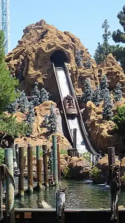 The Timber Mountain Log Ride is a themed log flume water dark ride at Knott's Berry Farm in Buena Park, California, United States. The ride is themed after the Knott's Calico Ghost Town. The ride is one of the oldest log flumes in the United States and is the most popular ride at Knott's Berry Farm.[1] Moreover, the Timber Mountain Log Ride celebrated its 50th anniversary on July 11, 2019 with unique merchandise, 2 new animatronic figures and the addition of a soundtrack developed exclusively for the log ride by Krazy Kirk and the Hillbillies.