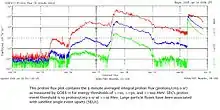 • A series of strong solar flares disrupted data taking for several days. On January 17 a very powerful radiation storm created multi-bit errors in the onboard computer memory, and saturated the telescope detectors so that GP-B lost track of the guide star. The science team, however, is confident that the temporary loss of science data will have no significant effect on the results. On January 20 the high level of proton flux was still generating "single bit errors" in GP-B memory, but the telescope is locked on the guide star again, and the gyroscope electronics seem to perform nominally.
