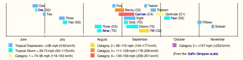 The 1974 season produced twenty tropical or subtropical depressions, of which eleven reached tropical (7) or subtropical (4) storm intensity. Four of the tropical storms became hurricanes, of which two became major hurricanes.[nb 2] At Category 4 on the Saffir–Simpson scale, Hurricane Carmen was the most intense tropical cyclone of the season. It threatened two densely populated areas during its duration, Belize City, Belize and New Orleans, Louisiana, but veered away at the last moment each time. Even so, the storm caused much flooding and crop damage in and around the Yucatán Peninsula and Gulf Coast of the United States.[4] The deadliest cyclone of 1974 was Hurricane Fifi (Category 2), which killed 6,000–8,000 people in Honduras, making it one of the deadliest Atlantic hurricanes on record.[5] As a result of their intensity and damage caused, the names Carman and Fifi were subsequently retired from reuse in the North Atlantic by the World Meteorological Organization.[6]
