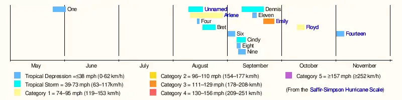 The season had fourteen tropical depressions, of which seven intensified into tropical storms—an average season has ten tropical storms[2]—three became hurricanes and one, Emily, became a major hurricane.[nb 1] The inactivity throughout the basin was linked to persistent, strong vertical wind shear; most of the season's storms were unable to intensify due to the shear, resulting in a low number of named storms and hurricanes.[1] The two most notable storms of the season were Hurricanes Arlene and Emily. Hurricane Arlene spent roughly 14.5 days as a tropical storm before intensifying into a hurricane, the longest span between these intensities on record.[4][nb 2] Hurricane Emily was the only major hurricane of the season; its wind speeds peaked at 125 miles per hour (201 km/h) before impacting the Dominican Republic. Three fatalities occurred in the Dominican Republic because of the storm and damages were estimated up to $80.3 million (1987 USD).[1][5][6][7]