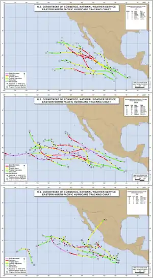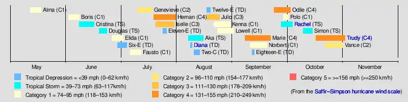 The season produced twenty-seven tropical depressions, of which twenty-one became named storms, and sixteen strengthened into hurricanes. Six out of the sixteen hurricanes strengthened into major hurricanes.[nb 1] Despite high levels of activity, Rachel was the only system to make landfall, bringing floods to Northwestern Mexico and the Southwestern United States.[1] Thousands were left homeless, and there were 18 confirmed fatalities.[4] Additionally, the remnants of Hurricane Boris brought light showers to California. At that time, Hurricane Hernan was the strongest Pacific hurricane to have its intensity estimated via satellite imagery; this record was matched by Hurricane Trudy months later.[1] One tropical storm formed in the Central Pacific Hurricane Center's warning zone and eventually crossed the International Dateline before dissipating.[5]