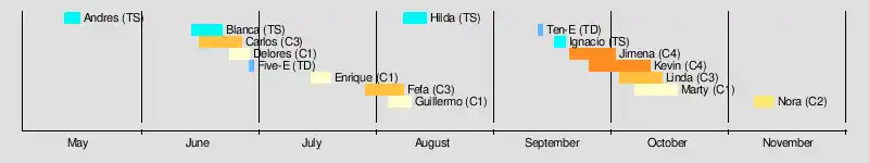 The 1991 Pacific hurricane season produced 16 tropical depressions, 14 of which became tropical storms or hurricanes. The season officially started on May 15, 1997 in the Eastern Pacific—designated as the area east of 140°W—and on June 1, 1997 in the Central Pacific, which is between the International Date Line and 140°W. The season officially ended in both basins on November 30, 1997. These dates typically limit the period of each year when most tropical cyclones form in the eastern Pacific basin. This timeline documents all the storm formations, strengthening, weakening, landfalls, extratropical transitions, as well as dissipation. The timeline also includes information which was not operationally released, meaning that information from post-storm reviews by the National Hurricane Center, such as information on a storm that was not operationally warned on, has been included.