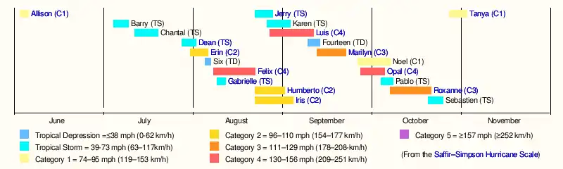 The 1995 Atlantic hurricane season was an event in the annual tropical cyclone season in the north Atlantic Ocean. This Atlantic hurricane season saw a near-record number of named tropical storms. This extremely active season followed four consecutive years in which there was below normal activity.[1][nb 1] The season officially began on June 1, 1995 and ended on November 30, 1995. These dates, adopted by convention, historically describe the period in each year when most tropical systems form.[3] The season's first system, Hurricane Allison, developed on June 3; its last, Hurricane Tanya, became extratropical on November 2.