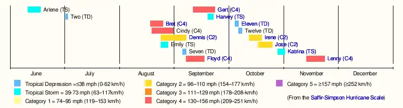 The 1999 Atlantic hurricane season was an event in the annual tropical cyclone season in the north Atlantic Ocean. This Atlantic hurricane season saw a near-average number of named tropical storms,[1][nb 1] though five of them became dangerous hurricanes of Category 4 intensity on the 5-level Saffir–Simpson scale, the most in a single season since 1886.[3] The season officially began on June 1, 1999 and ended on November 30, 1999. These dates, adopted by convention, historically describe the period in each year when most tropical systems form.[4] This season's first storm, Tropical Storm Arlene, formed on June 11, while the last, Hurricane Lenny, dissipated on November 23.