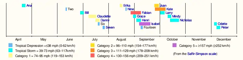 This season had 21 tropical depressions, of which, 16 became named storms. Of these, 7 strengthened into hurricanes with 3 intensifying into major hurricanes.[nb 1] Hurricane Fabian, Hurricane Isabel, and Hurricane Juan had their names retired due to the impact caused in Bermuda, the eastern United States, and Nova Scotia respectively. Both Fabian and Juan were the worst hurricanes to hit their respective areas, causing $450 million in damages and 16 fatalities.[2][3] Hurricane Isabel was the strongest, deadliest, and costliest storm of the season. Isabel peaked as a Category 5 hurricane over the open waters of the Atlantic; however, it weakened to a Category 2 before impacting the east coast of the United States, causing $3.6 billion in damages and 51 fatalities.[4]