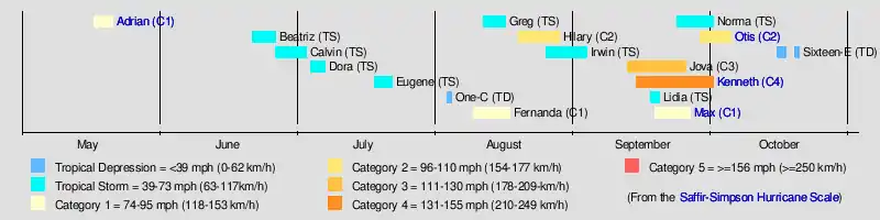 The first storm of the season, Hurricane Adrian, formed off the southwest coast of El Salvador and made the closest approach of any hurricane to the country on record. Most of June was quiet until the end of the month, when two tropical storms developed. July remained inactive as well, as only two tropical storms formed. In August, the activity picked up somewhat; the Central Pacific had its first and only depression of the year and four tropical storms, two of which became hurricanes, forming in the Eastern Pacific. September was the most active month of the year; six tropical storms formed, four of which became hurricanes, and two of the hurricanes strengthened further to become the only major hurricanes of the year. The strongest storm of the season was Hurricane Kenneth, whose remnants briefly threatened Hawaii near the end of the month. Activity sharply dropped off in October as only one tropical depression formed. No storms formed in November in both basins, and the season ended on November 30.