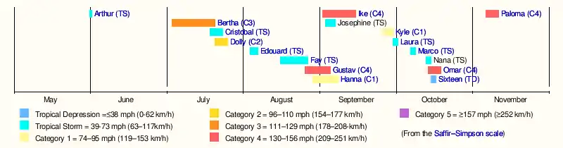 The season officially began on June 1, 2008, and ended on November 30, 2008, dates that conventionally delimit the period of each year when most tropical cyclones develop in the Atlantic basin.[3] The season's first storm, Tropical Storm Arthur, formed on May 30, and the last, Hurricane Paloma, dissipated on November 10. Pre-season forecasts noted a high possibility for an above average number of tropical cyclones, primarily due to lingering La Niña effects and abnormally warm sea surface temperatures across the Atlantic basin.[2] Altogether, 16 of the 17 tropical cyclones observed during the season developed into tropical storms. Of these, eight became hurricanes with five intensifying further into major hurricanes.[nb 3] With the exception of Tropical Storm Nana, every tropical cyclone during the season affected land to an extent.