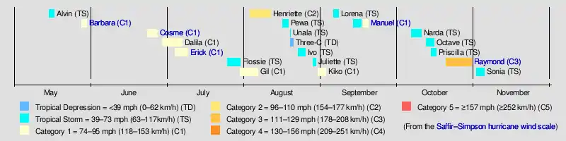 The season produced twenty-one tropical depressions. All but one further intensified into tropical storms and nine further intensified to become hurricanes. Despite this level of activity, only one hurricane – Raymond – strengthened into a major hurricane.[nb 3] The most significant storm, in terms of loss of life and damage, was Hurricane Manuel. Forming in mid-September, Manuel attained its peak as a minimal Category 1 hurricane before moving ashore the coastline of Mexico. In total, the storm contributed to 123 confirmed fatalities and $4.2 billion (2013 USD) in damage.[4] Throughout the duration of the season, four other named storms – Hurricane Barbara and tropical storms Juliette, Octave, and Sonia – made landfall in Mexico, causing minor damage and loss of life.