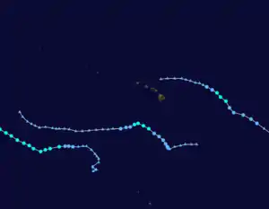 Four time zones are utilized in the basin: Central for storms east of 106.0°W, Mountain from 106.0°W to 114.9°W, Pacific from 115.0°W to 140.0°W,[8] and Hawaii–Aleutian for storms between the International Date Line and 140°W.[9] However, for convenience, all information is listed by Coordinated Universal Time (UTC) first with the respective local time included in parentheses. This timeline includes information that was not operationally released, meaning that data from post-storm reviews by the National Hurricane Center and Central Pacific Hurricane Center are included. This timeline documents tropical cyclone formations, strengthening, weakening, landfalls, extratropical transitions, and dissipations during the season.