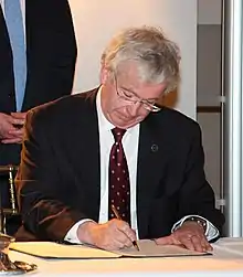 ![]() O'Shea signing an agreement between Peking University and Edinburgh University in 2012 | |