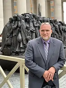 Timothy Schmalz (born in 1969) is a Canadian sculptor based out of St. Jacobs, Ontario, Canada. He focuses on religious figures and also has many public pieces. Schmalz is best known for his Homeless Jesus that he created in reaction to the many homeless living on the streets.[2][3] Schmalz conceives his sculptures with keen devotion to Catholicism and gives his time to each piece, sometimes taking as much as 10 years[4] forming the idea and sculpting it. Some of his works are created in series and others are single pieces. Schmalz has said, "If my sculptures are used by people as a tool to think, then Iām very happy."[4] Installments of his work have brought his visual message across the globe with Homeless Jesus having been displayed in many places including St. Peter's Basilica.[5]