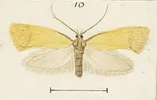 This species was first described by Edward Meyrick in 1883 using specimens collected at Hamilton and Cambridge in January and named Oecophora apanthes.[3][4] Meyrick gave a more detailed description under this name in 1884.[4] In 1915 Meyrick placed this species within the Borkhausenia genus.[5] In 1926 Alfred Philpott was unable to study the genitalia of the male of this species as a result of no specimens being available in New Zealand collections.[6] George Hudson discussed and illustrated this species under the name B. apanthes in his 1928 publication The butterflies and moths of New Zealand.[7] In 1988 J. S. Dugdale placed this species in the genus Tingena.[2] His also discussed Hudson's illustration of this species and alleged that it was dubious as Dugdale regarded the illustration as too yellow for T. apanthes.[2] The male lectotype, collected in Cambridge, is held at the Natural History Museum, London.[2]