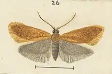 ♂ . 15 mm. Head fuscous, sprinkled with pale yellowish hairs. Palpi whitish-yellowish, sprinkled with dark fuscous. Antennae whitish-yellowish, ringed with dark fuscous. Thorax ochreous-yellow, anteriorly suffused with fuscous. Abdomen grey. Fore-wings elongate, costa gently arched, apex obtuse, termen slightly rounded, rather strongly oblique ; deep ochreous-yellow, finely sprinkled throughout with brown ; extreme costal edge dark fuscous towards base : cilia ochreous-yellow, somewhat sprinkled with brown. Hind-wings dark grey ; cilia whitish-grey, with grey basal shade.[3]