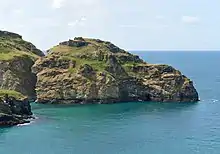 There are many other relics of antiquity to be found here such as the so-called King Arthur's Footprint on the Island and a carved rock from Starapark which has been placed outside the Sir James Smith's School at Dark Lane, Camelford. Rodney Castleden has written about these as Bronze Age ritual objects.[24] "King Arthur's Footprint" is a hollow in the rock at the highest point of Tintagel Island's southern side. It is not entirely natural, having been shaped by human hands at some stage.[25] It may have been used for the inauguration of kings or chieftains as the site is known to have a long history stretching back to the Dark Ages. The name is probably a 19th-century invention by the castle guide.