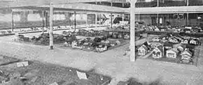 The miniature city project involved students from eighteen Springfield public high schools. The students, who were learning construction and handicraft, built the city of about 1,200 structures under the supervision of their teachers. It consisted of 1,000 miniature houses, in several neighborhoods, and 200 other structures. The miniature buildings and houses were built according to standard construction plans, and lumber and building-materials companies donated items for the project.[21] The buildings and homes were landscaped with real grass.[22] Their interiors were furnished and decorated like a full-sized house or building.[23] The buildings were scaled at one-half inch to the foot.[24] Tiny Town, with water mains and electric lights, was laid out on streets like a real city.[1]