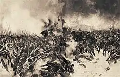 On 8 February IV Corps arrived in the area of Preußisch Eylau, where a major fight was unfolding. The corps was sent to the far west and began an assault on Russian positions, however the Russians stopped the corps and when the vanguard of III Corps arrived, they were intercepted by the Cavalry Reserve, thereby causing IV Corps to be held up.[22] By 22:00 hours both sides disengaged, with both armies losing at least 15,000 troops, and by 23:00 the Russians withdrew with the French barely victorious.[4][22][23]