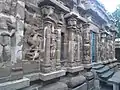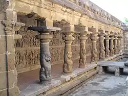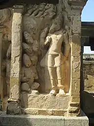 The cloister walls have a sequence of relief sculptures depicting the history of the Pallava dynasty.[11] The first set of panels show the supposedly divine lineage of the Pallavas starting from Brahma, followed by Angiras (sage), Bṛhaspati, Bharadwaja, Drona and Ashwatthama. These panels are followed by panels depicting the actual Pallava kings themselves. A typical panel shows the king on the left frame of the panel. In some cases, the coronation of the king is shown as can be seen by priests pouring sacred water on his head. The right side of the panel shows battle scenes or other events during that monarch's reign. The panels of Mahendravarman I and Narasimhavarman I show the battles with Pulakesin II of the Badami Chalukyas. Finally, there are panels that show the search and the finding of a successor after Paramesvaravarman II's early death. The successor is none other than Nandivarman II, who built this temple.
