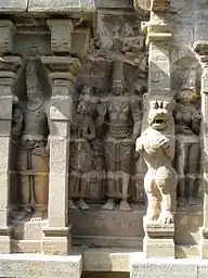 As per Dr. Hultzh, Parameswara Vinnagaram was constructed by the Pallava King Nandivarman II in 690 CE, while other scholars place it in the late 8th century.[5] Nandivarman Pallavamallan was a worshipper of Vishnu and a great patron of learning. He renovated old temples and built several new ones. Among the latter was the Parameswara Vinnagaram or the Vaikunta Perumal temple at Kanchipuram which contains inscribed panels of sculpture portraying the events leading up to the accession of Nandivarman Pallavamalla to the throne. The great Vaishnava saint Thirumangai Alvar was his contemporary.[6][7][8] There are various inscriptions in the temple that detail the socio-economic and political situation of the country during the Pallavan regime. Around the sanctum sanctorum in the first precinct, there is an inscription dated to the 8th century which records the gift of a bowl and an image made of gold measuring 1,000 sovereigns by king Abhimanasiddhi. During the period of Dantivarman I in 813, there was a gift of golden bowl weighing ten thousand kalanju. There was another gift of 3,000 kalanju of gold to meet daily expenses of the temple. A record of gift of a devotee named Thiruvaranga Manickam to feed devotees of Vishnu is also seen in the temple.[3] The temple is believed to have been constructed few years after the construction of Kanchi Kailasanathar Temple. The bas reliefs in the temple reveal the war between the Pallavas and Gangas and also with Chalukyas.[9]