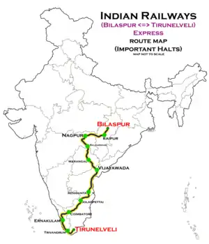 It operates as train number 22620 from Tirunelveli Junction to Bilaspur Junction and as train number 22619 in the reverse direction, serving the states of Kerala, Tamil Nadu, Andhra Pradesh, Telangana, Maharashtra & Chhattisgarh.[2]