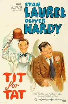 Tit for Tat is a 1935 short comedy film starring Stan Laurel and Oliver Hardy. It is the only direct sequel they made, following the story of Them Thar Hills, which was released the previous year and includes the same two supporting characters, Mr. and Mrs. Hall, portrayed by Charlie Hall and Mae Busch.[2] This "two-reeler" is notable too for being nominated for an Academy Award as Best Live Action Short Film (Comedy) of 1935, although it did not win.[3] It also has a central theme similar to the comedy duo's 1929 silent short Big Business. In the opening scene of Tit for Tat, Oliver places a sign in the front window of his and Stan's electrical store. It reads "Open for Big Business", an allusion to the escalating revenge and "reciprocal destruction" common to both films.[4][5]