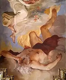 The poem's common name comes from the Greek myth of Tithonus, which is mentioned in lines 9 to 12 of the poem. According to legend Tithonus was a Trojan prince, loved by Eos, the goddess Dawn. She asked that Zeus make her lover immortal; he granted the request, but as she did not ask for eternal youth for Tithonus, he continued to age for eternity. The story of Tithonus was popular in archaic Greek poetry, though the reference to him in this poem seems out of place, according to Rawles.[14] However, Page duBois notes that the use of a mythical exemplum to illustrate the point of a poem, such as the story of Tithonus in this poem, is a characteristic feature of Sappho's poetry – duBois compares it to Sappho's use of the story of Helen in fragment 16.[15] Martin Litchfield West considers that these lines seem like a weak ending to the poem, though Tithonus functions as a parallel to Sappho in her old age.[16]